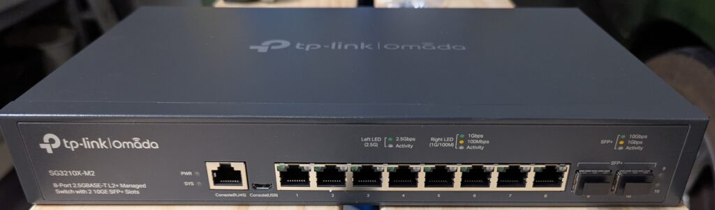 The QNAP QSW-M2116P-2T2S is almost the ideal switch, but the price is high, availability was poor and the management was basic (no SNMP at the time for example). Also there had been some complaints about the pitch of the fans even when running slow. There were a lot of switches found on aliexpress but working out what the management quality was like, what the noise levels were like and future support were all concerns. In the end I settled on a combination of the TP-Link SG3210X-M2 and TP-Link SG2210XMP-M2. Functionality wise the switches are practically identical, but with the SG2210XMP-M2 including PoE. The switches each have 2x10G SFP+ which left only 2 free after using two of the SFP+’s to join the switches. Ideally there would have been more, but this was ok for now.