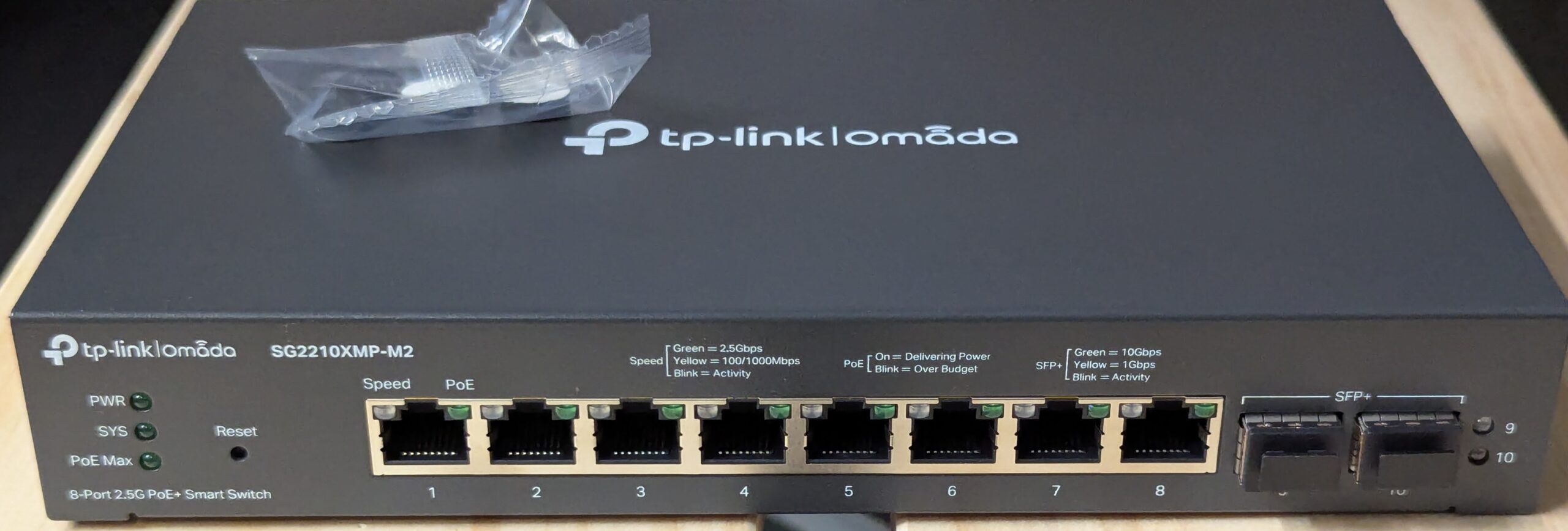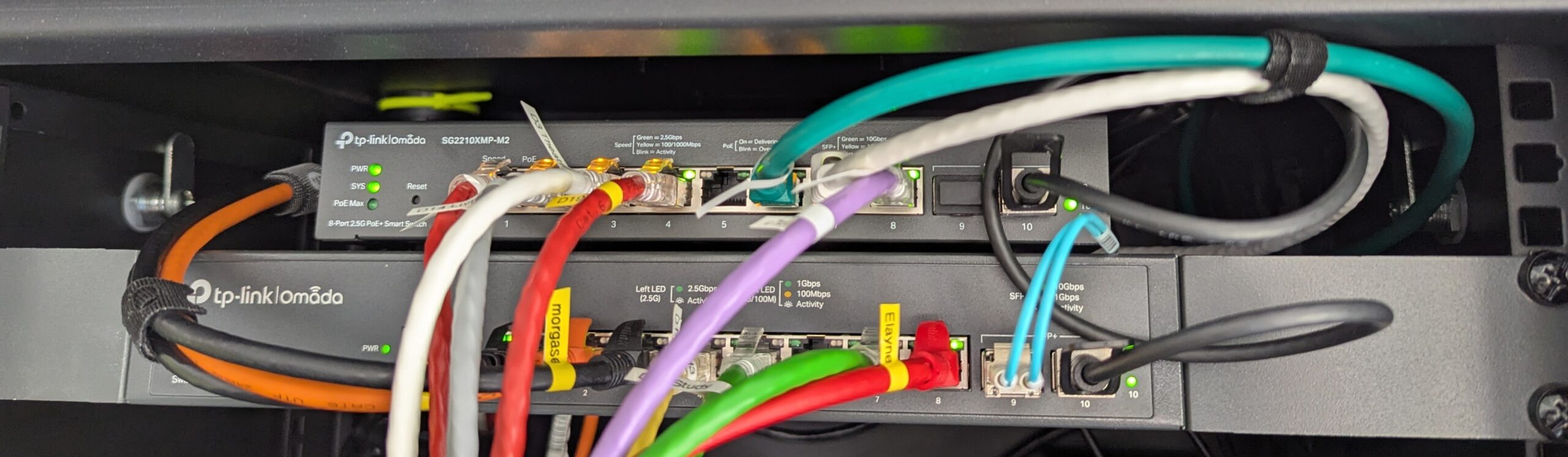 The QNAP QSW-M2116P-2T2S is almost the ideal switch, but the price is high, availability was poor and the management was basic (no SNMP at the time for example). Also there had been some complaints about the pitch of the fans even when running slow. There were a lot of switches found on aliexpress but working out what the management quality was like, what the noise levels were like and future support were all concerns. In the end I settled on a combination of the TP-Link SG3210X-M2 and TP-Link SG2210XMP-M2. Functionality wise the switches are practically identical, but with the SG2210XMP-M2 including PoE. The switches each have 2x10G SFP+ which left only 2 free after using two of the SFP+’s to join the switches. Ideally there would have been more, but this was ok for now.