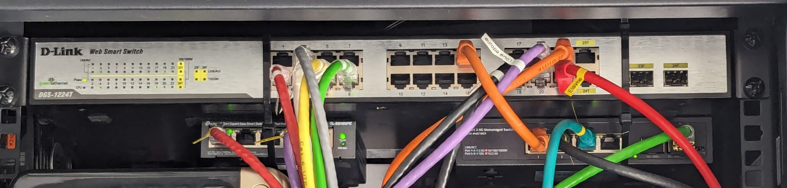 The addition of a new Unifi Pro 7 access point meant that it was now desirable to have a 2.5G PoE+ port on the switch. The existing rack had combination of a 24x1G managed switch, a 4×2.5G + 2xSFP+ un-managed switch and a 5x1G PoE managed (using that term loosely here, management was very basic and insecure). So while there was PoE and there was 2.5G there was no 2.5G with PoE. It was also a bit of a mess with two small switches being cabled tied to the larger switch. So it seemed that it was time to upgrade form the mess to something a little cleaner.