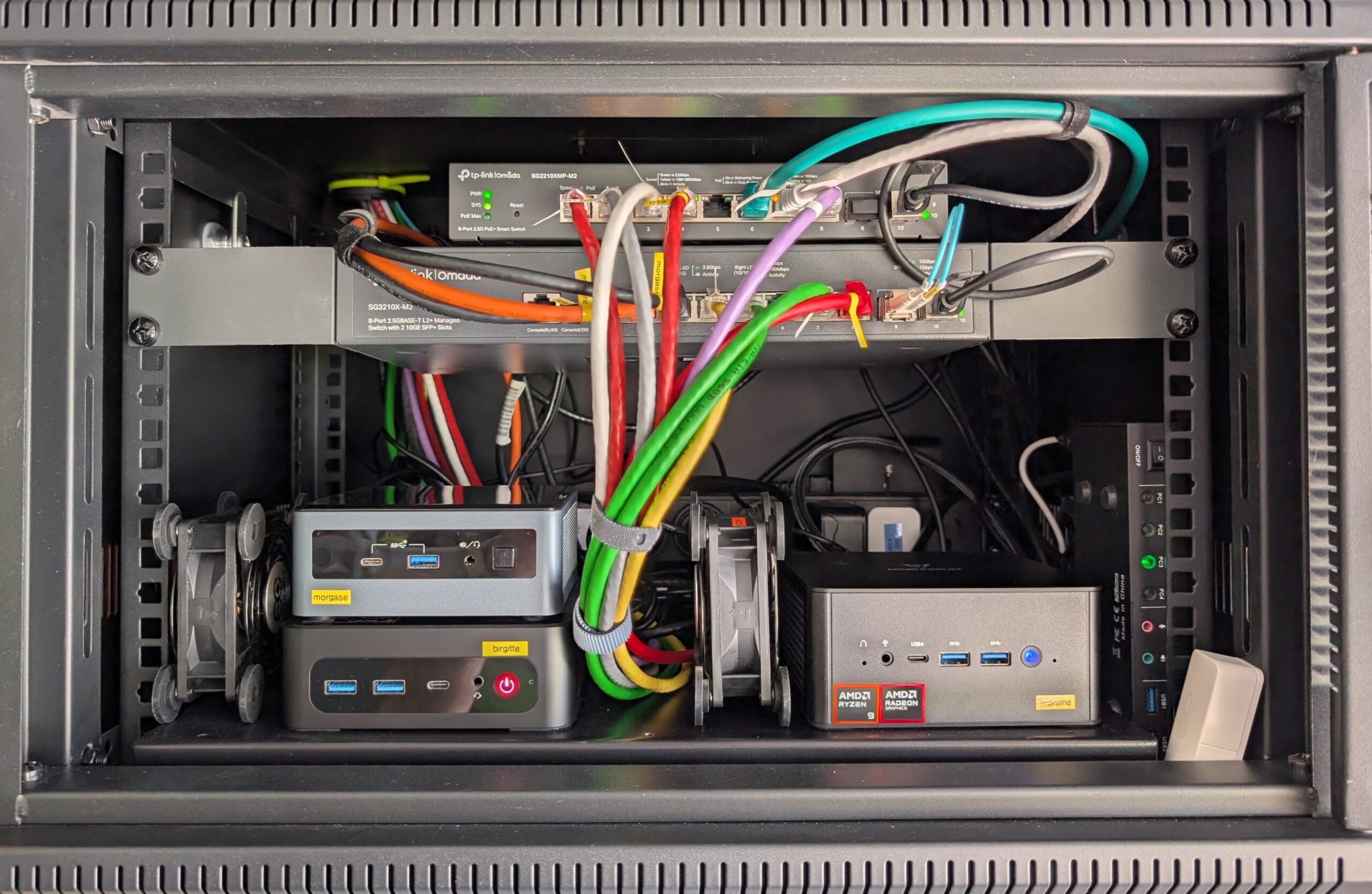 The final setup consists of the two switches with a 10G SFP+ DAC cable connecting them. As the SG2210XMP-M2 is not rack mountable it was placed on top the SG3210X-M2. A 10GBASE-LR SFP+ is installed in of the free SFP+ ports for a connection through to a switch in the office rack. The three mini PCs and the NAS (it is beside the rack, not in it) are all connected via 2.5G port. Monitoring is performed using SNMP using a librenms instance. For the web UI https certificates I am using the CLI (via ssh with public key authorisation and expect) to upload the letsencrypt certificate and the keys (generated using lego with DNS validation for internal only names). This has been running for 9 months without any issues.